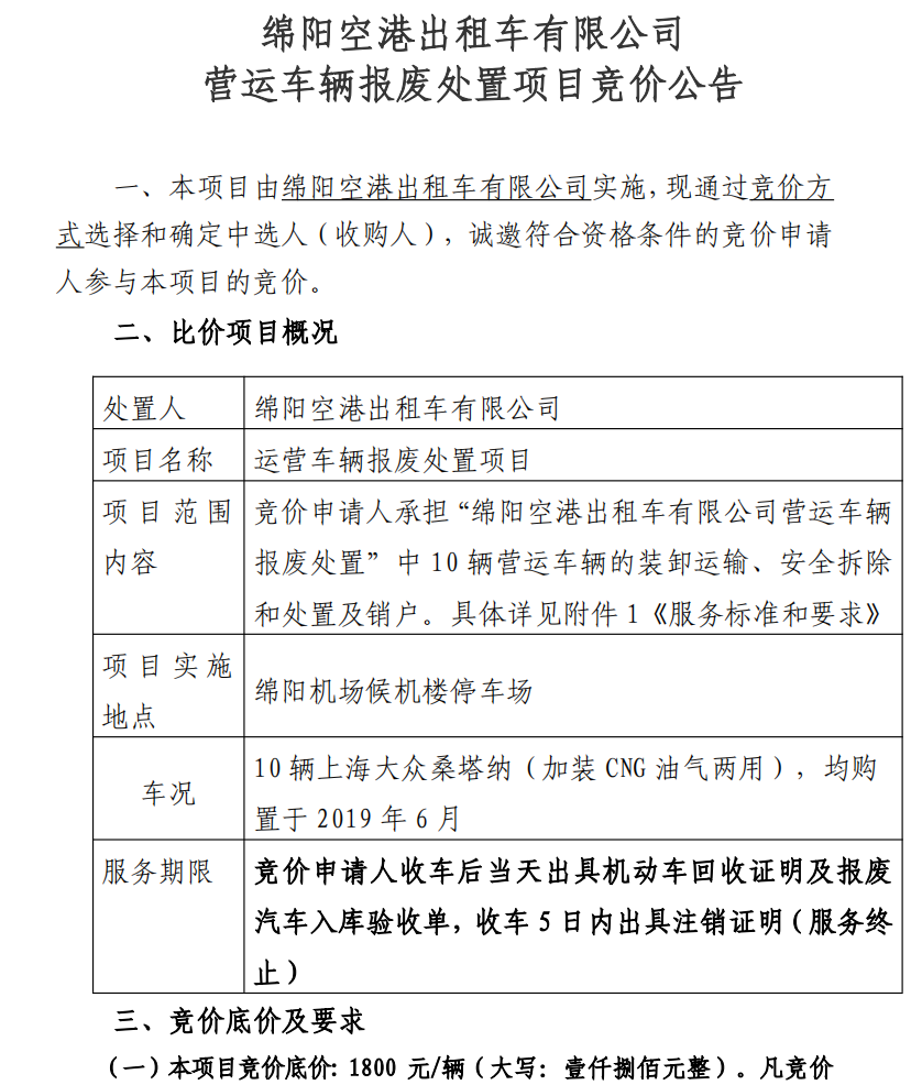 綿陽(yáng)空港出租車有限公司營(yíng)運(yùn)車輛報(bào)廢處置項(xiàng)目競(jìng)價(jià)公告