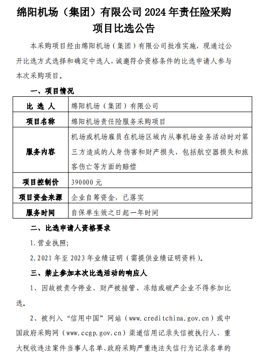 綿陽(yáng)機(jī)場(chǎng)(集團(tuán))有限公司2024年責(zé)任險(xiǎn)采購(gòu)項(xiàng)目比選公告